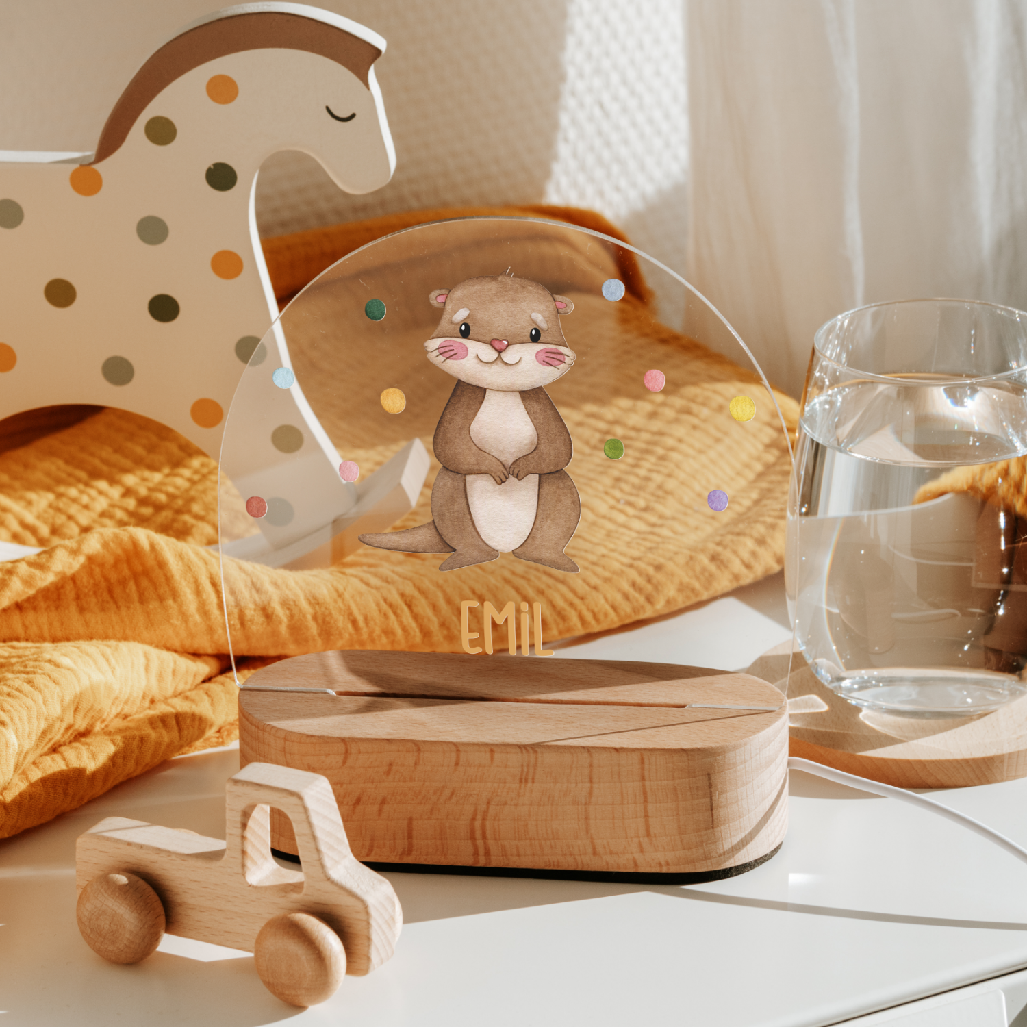 Sie können es mit dem Namen Ihres Kindes sowie individuellen Tiermotiven gestalten. Das personalisierte Design macht jedes Licht einzigartig und zu einem ganz besonderen Begleiter für Ihr Kind.