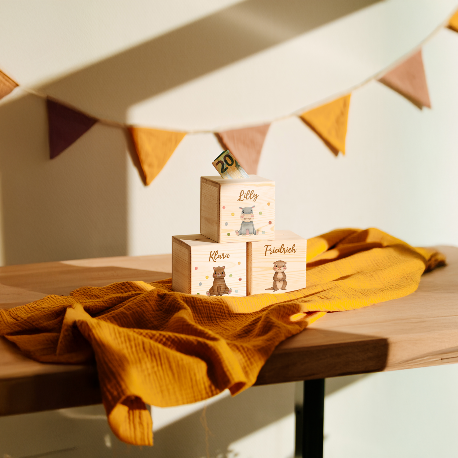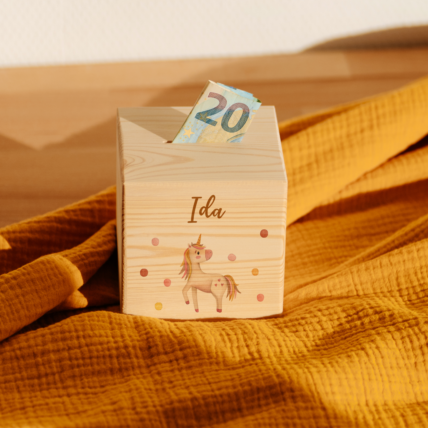 Die personalisierte Holzspardose eignet sich hervorragend als Geschenk zur Geburt, Taufe, zum Geburtstag oder zu besonderen Anlässen. Sie bietet nicht nur ein Sparabenteuer, sondern wird auch zu einem wertvollen Erinnerungsstück, das Ihr Kind viele Jahre begleiten wird.