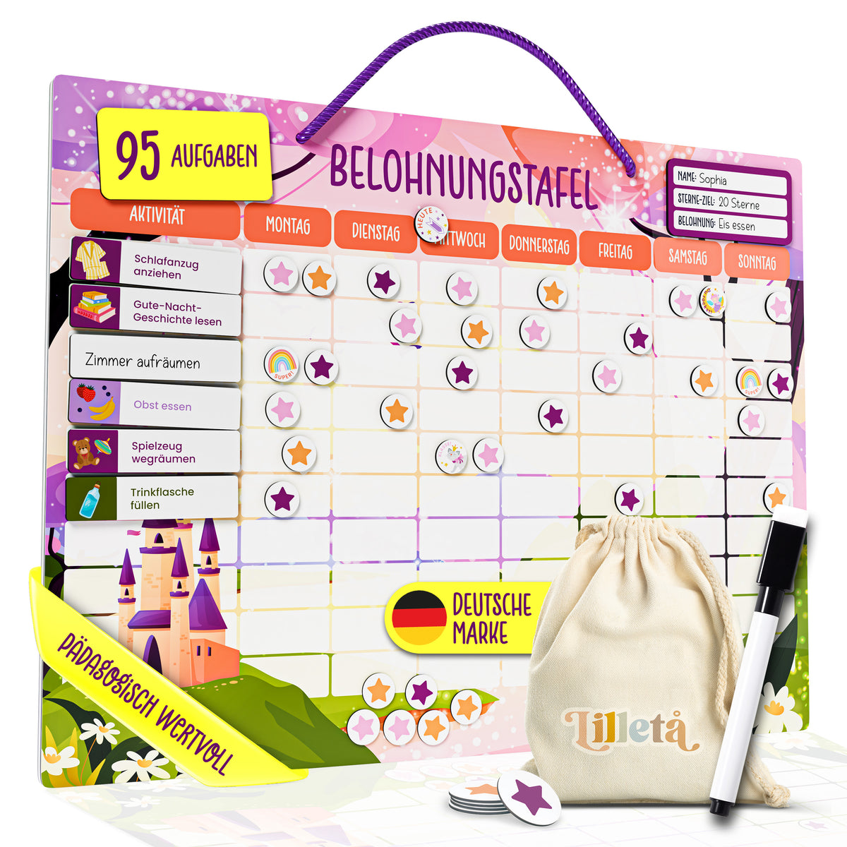 Mit der Lilleta® Belohnungstafel für Kinder wird Motivation zum Kinderspiel. Kinder lernen, Verantwortung zu übernehmen und ihre Erfolge sichtbar zu machen – mit Spaß statt Druck. Für jede erledigte Aufgabe gibt es einen Stern, der Stolz und Selbstvertrauen stärkt.