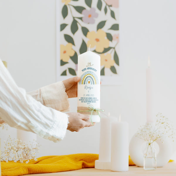 Gestalte die Kommunionskerze ganz nach deinen Wünschen – mit einem liebevollen Motiv, dem Namen und dem Kommunionsdatum des Kindes. So entsteht ein einzigartiges Erinnerungsstück, das diesen besonderen Tag für immer bewahrt.