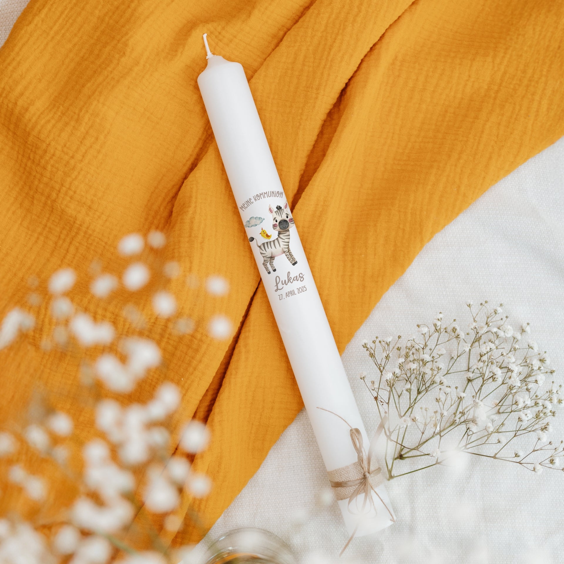 Diese personalisierbare Kommunionskerze aus hochwertigem Wachs ist ein echtes Highlight bei jeder Kommunionsfeier! Sie schmückt den festlichen Rahmen und schafft einen unvergesslichen Moment, wenn sie feierlich entzündet wird.