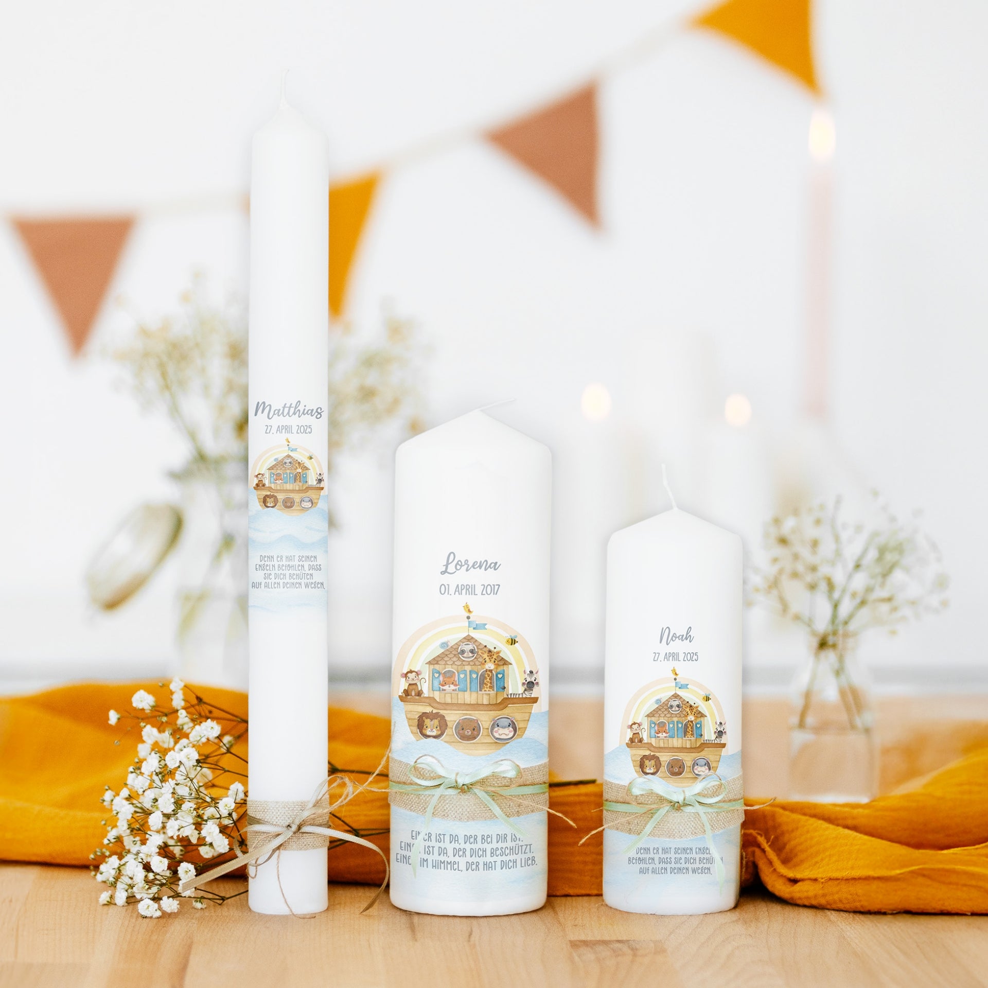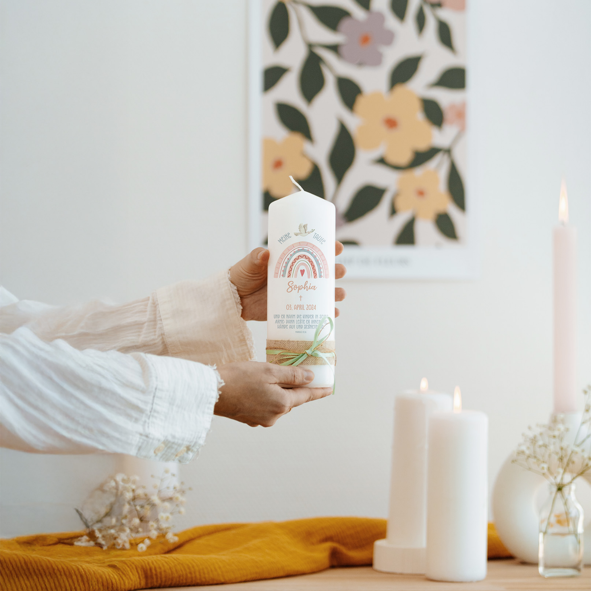 Gestalte die Taufkerze ganz nach deinen Wünschen – mit einem liebevollen Motiv, dem Namen und dem Taufdatum des Kindes. So entsteht ein einzigartiges Erinnerungsstück, das diesen besonderen Tag für immer bewahrt.